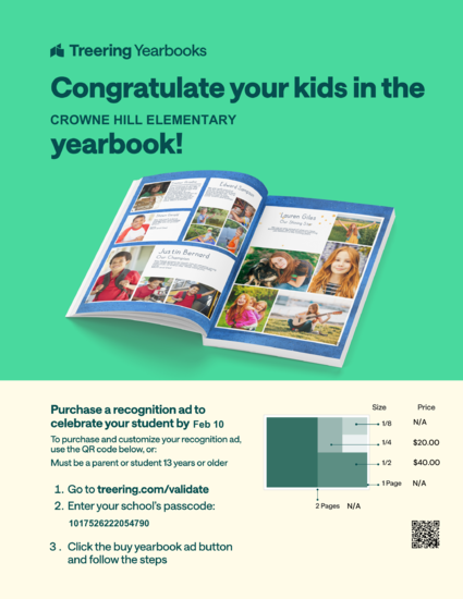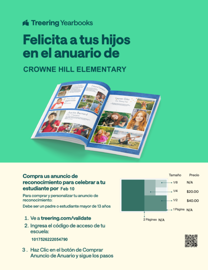 Capture your memories this year with a Crowne Hill Elementary Yearbook! Get your book now for $25.00.